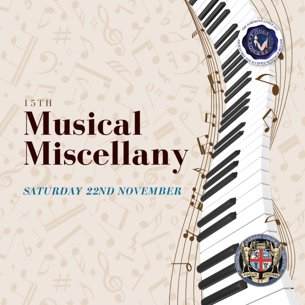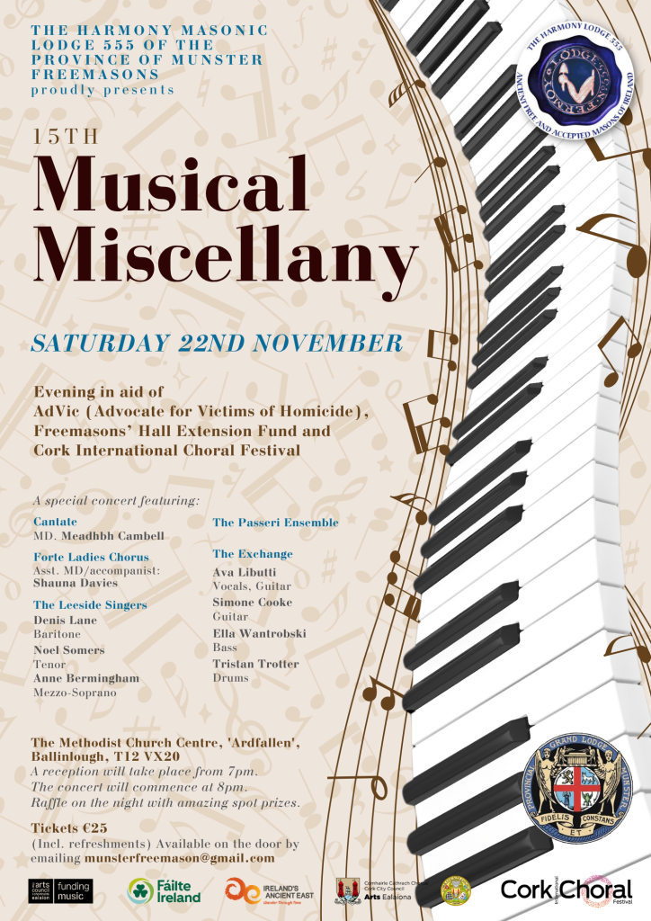 Cork Freemasons Presents 15th Musical Miscellany Saturday 22nd November 2025, from 7 pmThe Methodist Church Centre, 'Ardfallen', Ballinlough, This year's…